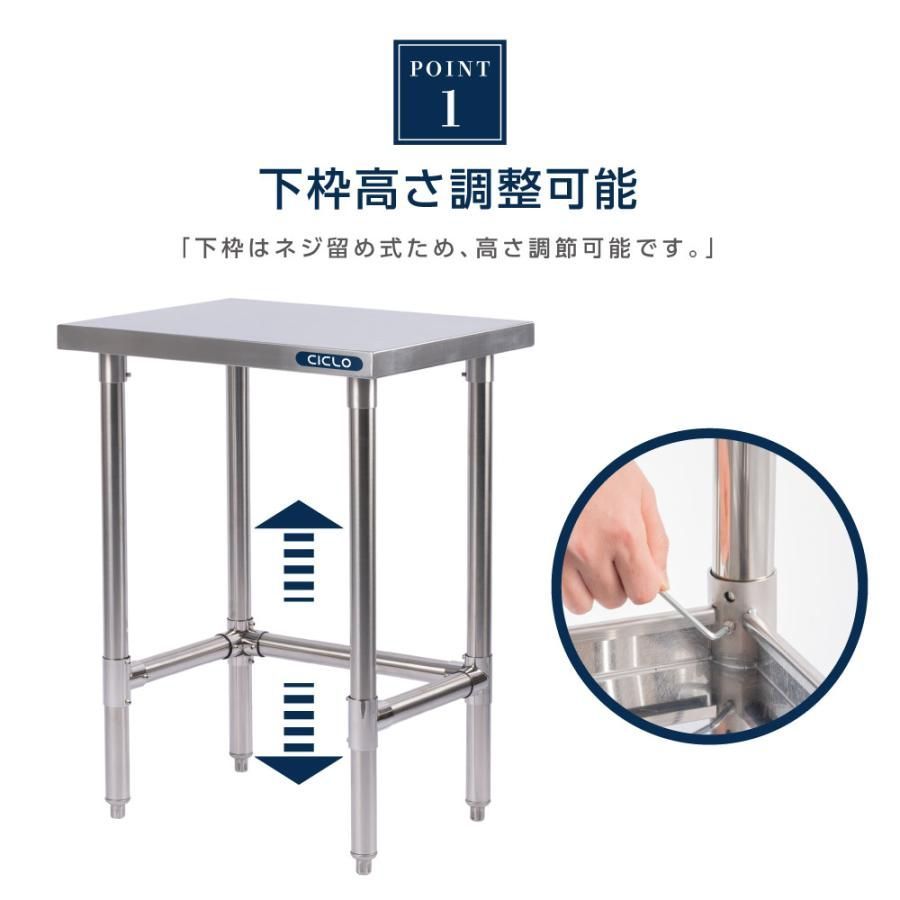 【製品の強み】作業台は錆びにくく丈夫なステンレス製。水分や洗剤、消毒用アルコールに強くお手入れが簡単です。おどろきの板厚約1.2mmのステンレス採用、しっかりとした厚みだからこそ!頑丈で安心の強度を実現しました。30mmの棚板を採用、たわみを軽減します。天板と棚板の表面にヘアライン加工を施しました。キズに強く、汚れや臭いがつきにくいので食品工場や厨房・倉庫等でご使用いただけます!
