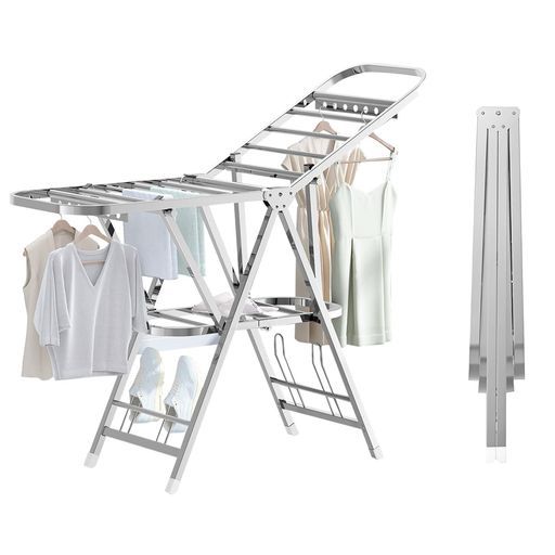【高さ調節可能】両翼は高さ調節可能なので、シャツ、タオルはもちろん、丈の長いワンピースやコートなどでも掛けられます。靴掛けと靴下干し用クリップが付きます。
