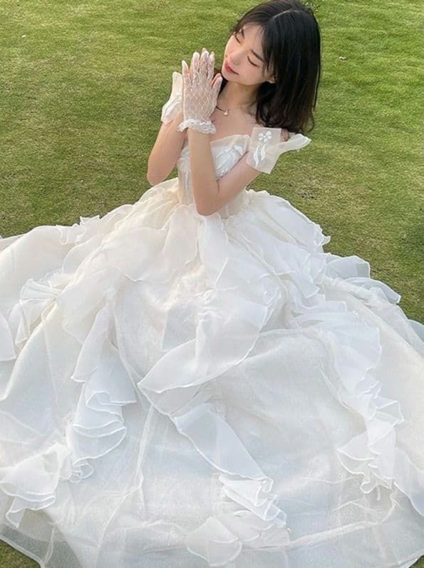 軽やかなフリルが映えるガーデン風プリンセスウェディングドレス