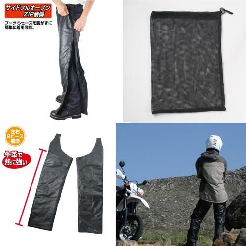 固定はベルト吊り下げ式でサイドファスナーはフルオープンが可能なので、ブーツを履いたまま脱ぎ履き可能な防護兼防寒チャップスです。